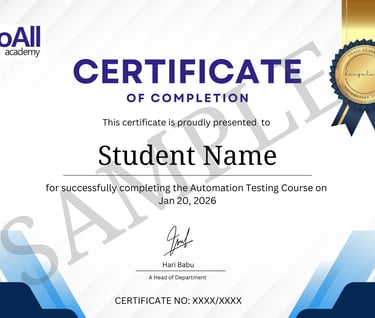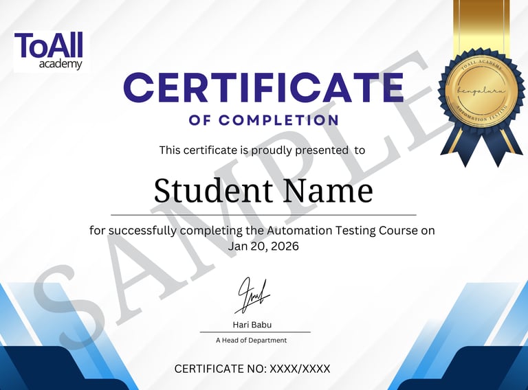 At ToAll Academy, every learner who successfully completes our Automation Testing program receives an industry-recognized Course Completion Certificate.